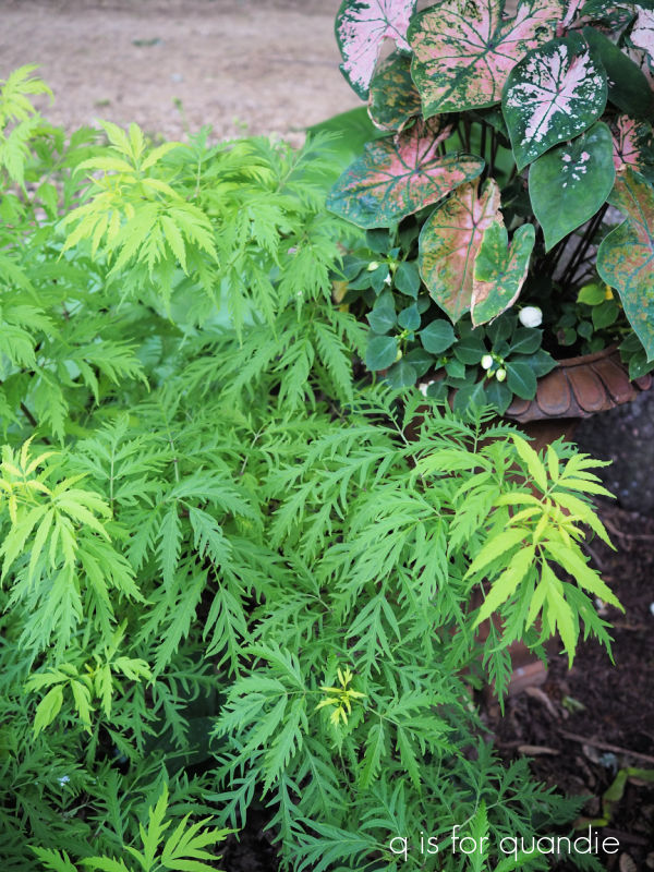There are lots of fabulous annuals with lime green foliage too. Last year I had Wasabi coleus and Lemon Coral sedum (far right) in my front window box.