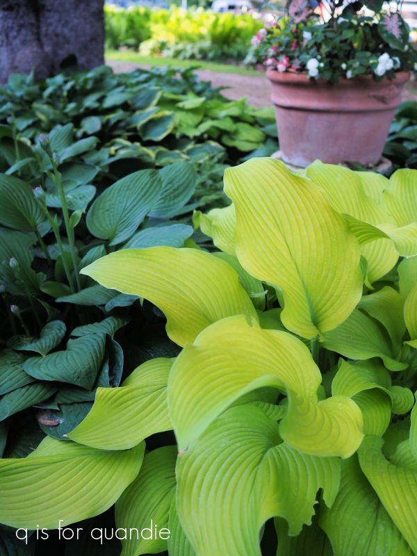 I’ve left the most obvious example of lime green foliage plants for last, hostas! You know I love ’em. And there are lots and lots of options for lime green in hostas.