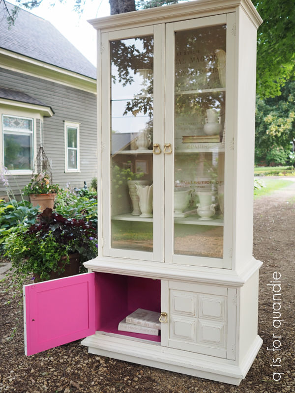 I picked up that hutch at a garage sale earlier this summer.  I thought it looked a bit outdated in that wood tone, with those aged brass knobs.  I knew it would be fun to give it a new lease on life.