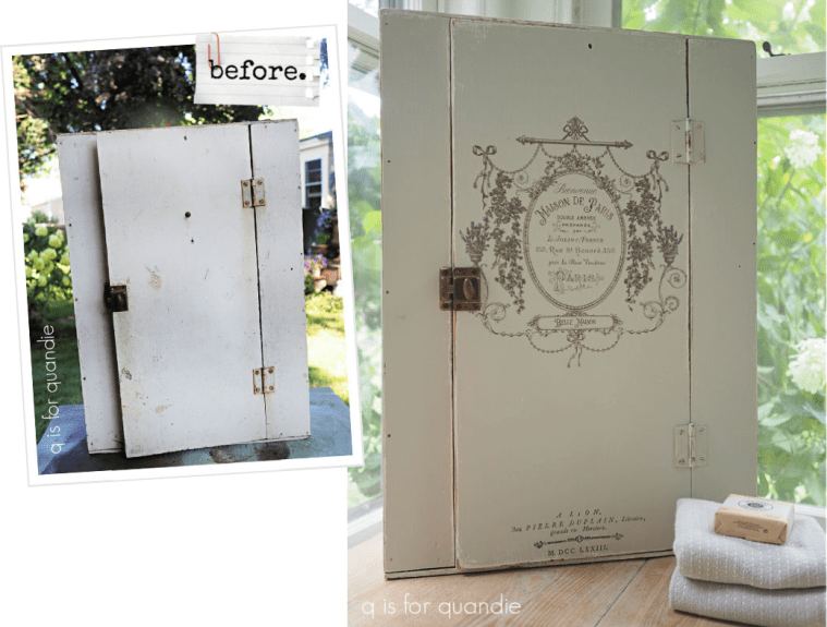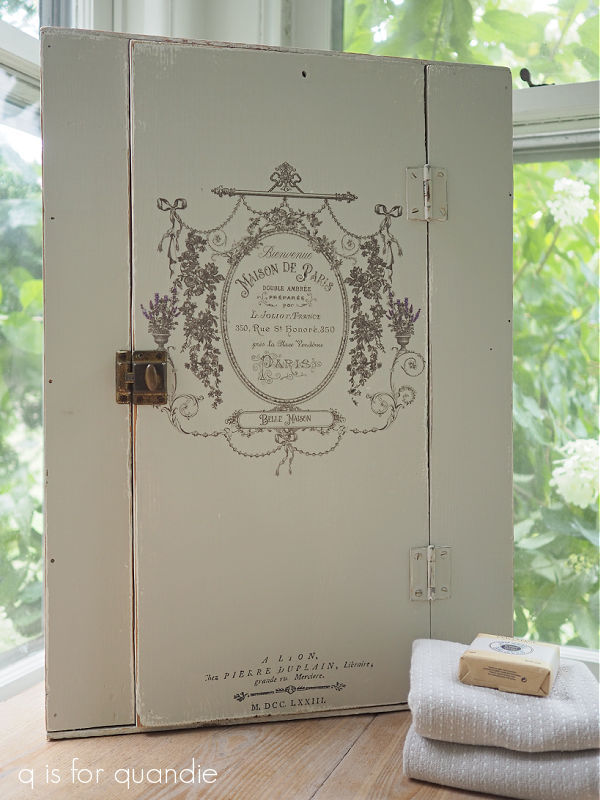 Today I’m sharing the makeover of that wooden medicine cabinet that my friend opK found for me at a garage sale.