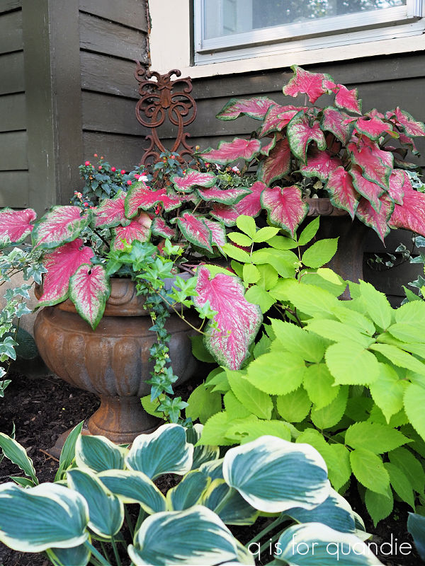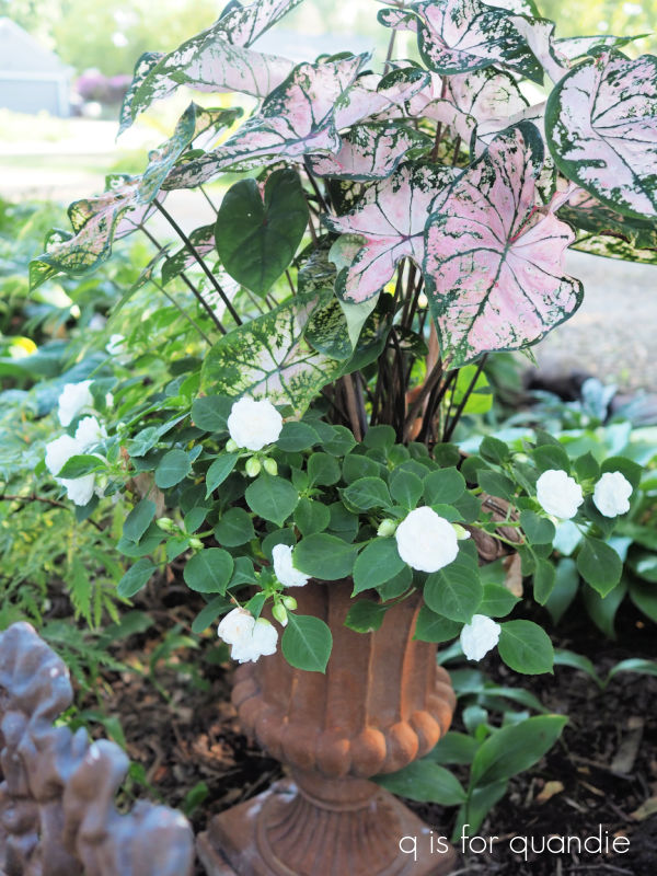 I repeated the combination of caladium with double impatiens in a couple of planters in my shade garden again this year.