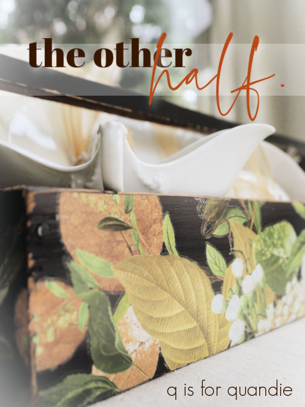 Once the paint was dry, I pulled out that 2nd sheet from the Harvest Hues transfer that I used on the tackle box I shared on Monday.  Remember?  It’s the one that I damaged by allowing it to roll up on itself.  But luckily, the undamaged portion was just long enough to fit the side of this caddy.