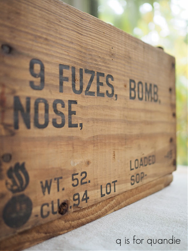 Apparently it once held bombs. I’m not sure what she was doing with a box of bombs … uh oh, maybe I shouldn’t be saying ‘bomb’ so much, my blog is going to end up on some kind of a watch list.