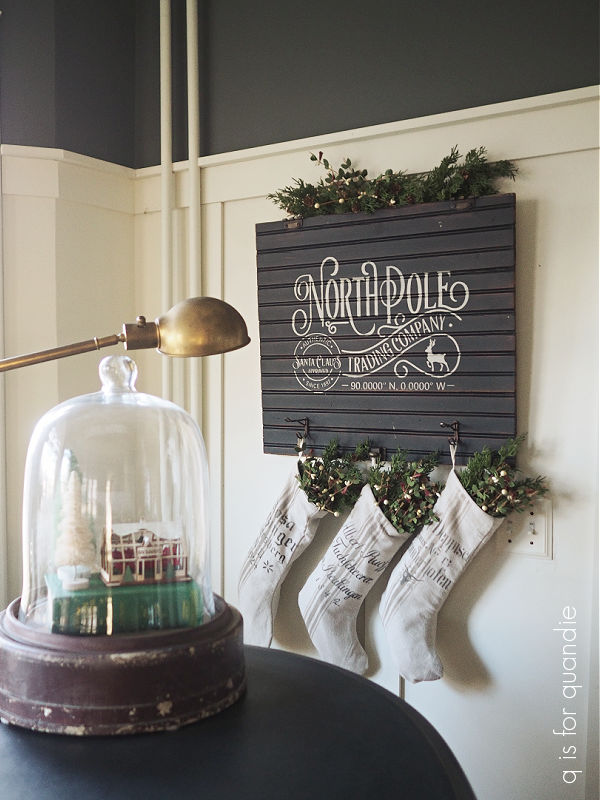The beadboard is a wonderful stocking holder! I love how you use vintage stuff so beautifully as Christmas decor. My favorite thing might be the mini greenhouse and cloche. Fascinating!