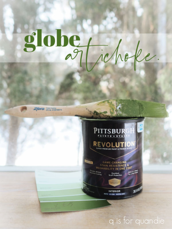 When I first painted up the Sure Swatch with Globe Artichoke I thought for sure that it was not going to be the right color.  It was too light, and way more olive than I thought I wanted.  But I painted the swatch in the piano room, which gets a lot more light.  When I put the swatch on the wall in the q branch (these swatches have a post-it note like stickiness on the back), I realized that it was exactly what I was looking for.