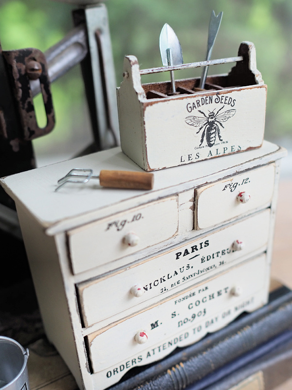 I know you love and appreciate Ken so much and he has gardening skills along with his amazing carpentry skills. The mini Adirondack chair is so charming. But I have to say I’m really green eyed over the tiny wood tote and dresser! I love minis. I do most of my sourcing at the Goodwill bins outlet and I did through the small stuff at the bottom of the bins to find some amazing miniature things.