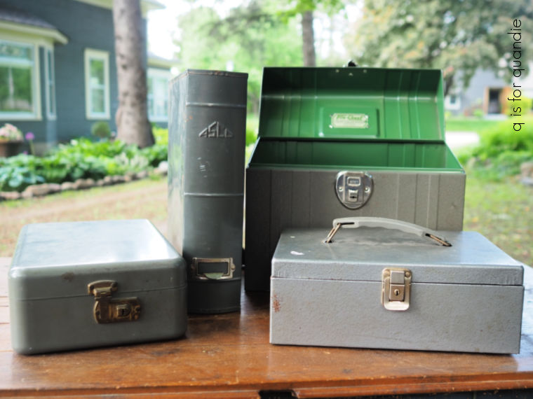 Two are typical lockboxes (that have lost their keys), and the one with the green interior is a file box.