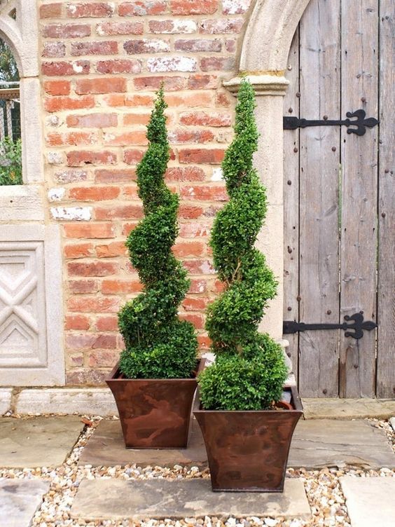 I usually fill this pair of pots with flowering annuals in the summer, but this year I decided to try something a little different. I wanted to go with boxwood spirals, like these.