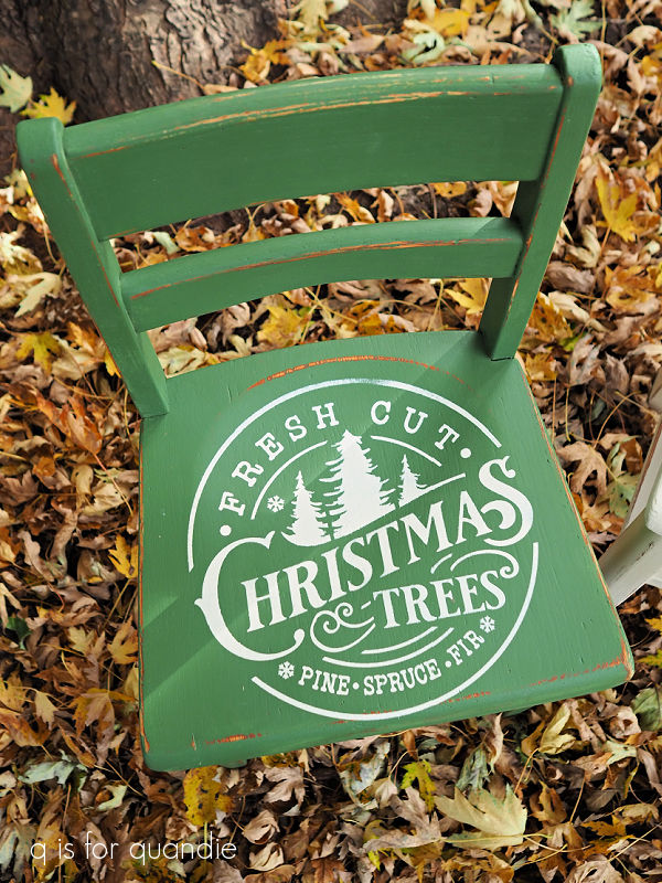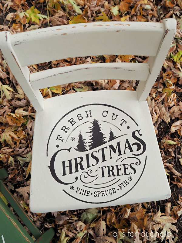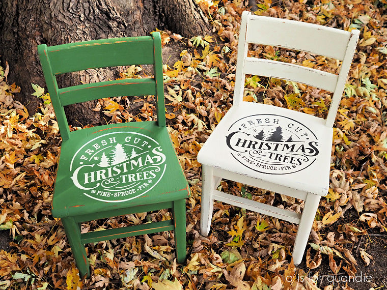 I added it to the green chair using DB’s Drop Cloth, and to the white chair using their Coffee Bean, just in case someone out there prefers a more neutral Christmas color scheme.