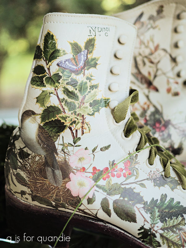 I swapped out the laces for some red velvet ribbon, and I tucked some faux greenery into the top of each skate.