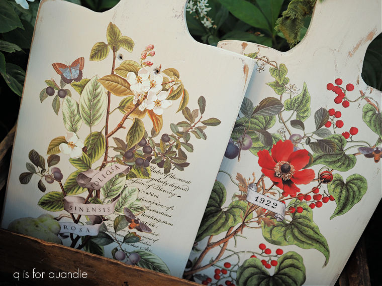 Sometimes it’s just because I didn’t think there was much to say about them.  For example, I painted up some faux cutting boards earlier this fall, and then added some of the I.O.D. Clementine transfers to them.
