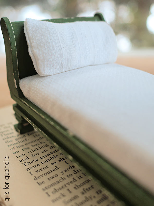 Next came dressing the bed. Unfortunately, I didn’t have just the right vintage tea towel to use on this one. I did have a nice plain white linen towel though, so I decided to go ahead with that.