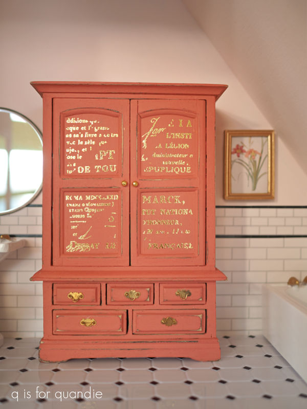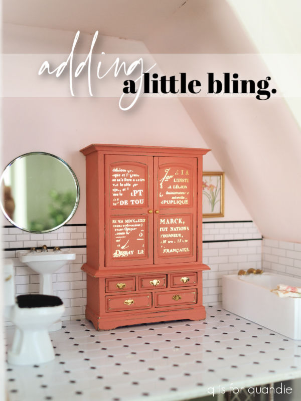 After putting the fixtures in place, I had enough room to add the blanket cabinet that I painted up last year in Dixie Belle’s Cottage Door. It has a little more of that gold bling in the form of the I.O.D. Étiquettes gilded transfer on the doors.