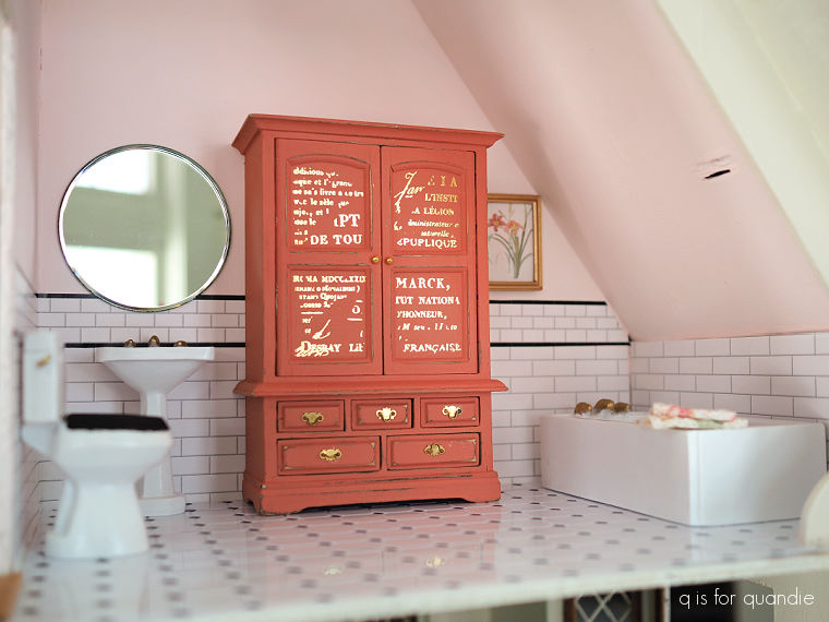 I started with the walls, painting them in the same Pink Champagne that I used in the craft room. Then I pulled out some scraps of subway tile ‘wallpaper’ that were left over from the kitchen in my last miniature project …