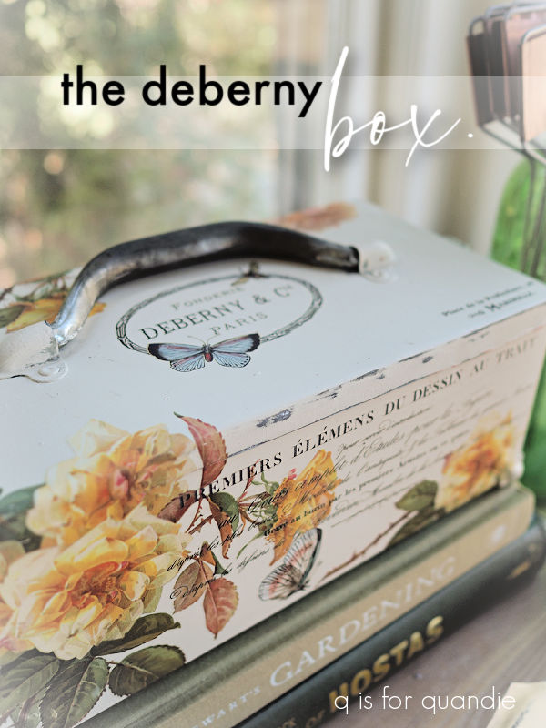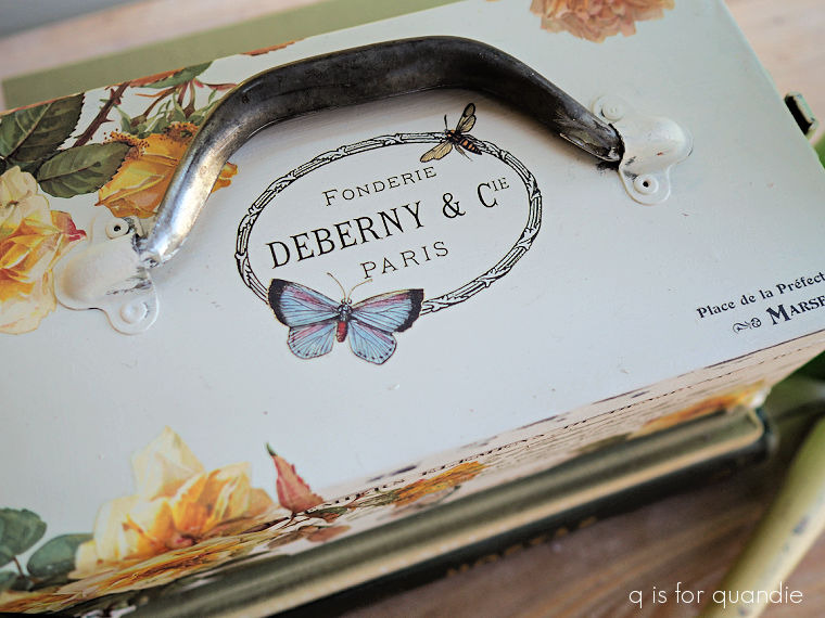Next I painted the exterior of the box in Dixie Belle’s Drop Cloth. Then I pulled out I.O.D.’s By Any Other Name transfer and chose some roses that I thought would be perfect on this box.