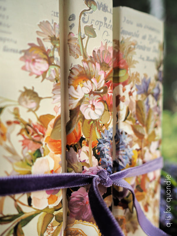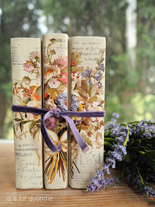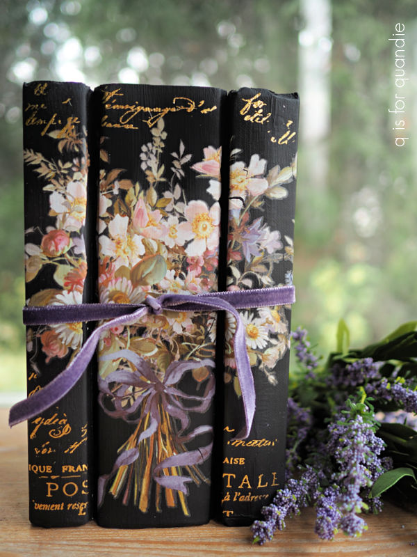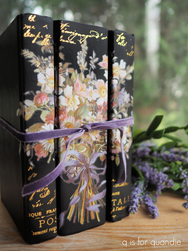 After applying some of Dixie Belle’s clear wax to protect the paint and transfer, I gathered the books together with a pretty purple velvet ribbon.