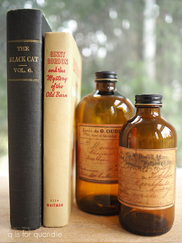I picked up the vintage book because I thought the title, The Black Cat, would be perfect for Halloween. I love the idea of giving a subtle nod to holiday decorating without being overt and this book paired with some apothecary style bottles works for me.