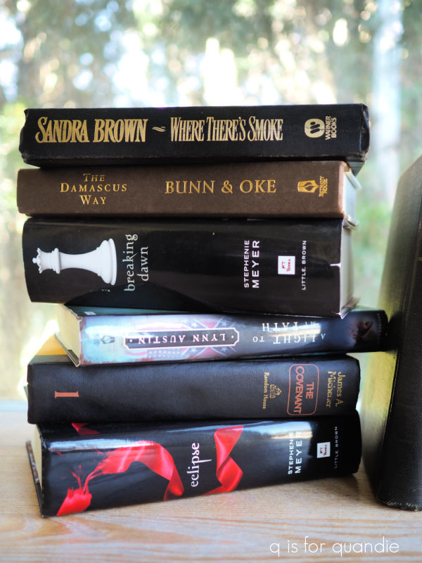 I painted the first three books in Dixie Belle’s Drop Cloth. To do this I simply open the books and place them face down on my worktable (a.k.a. my piano) and paint the covers with a brush. I sometimes can get away with just two coats, but painting the Drop Cloth over a book that is black (or in this case one was yellow) takes three coats.