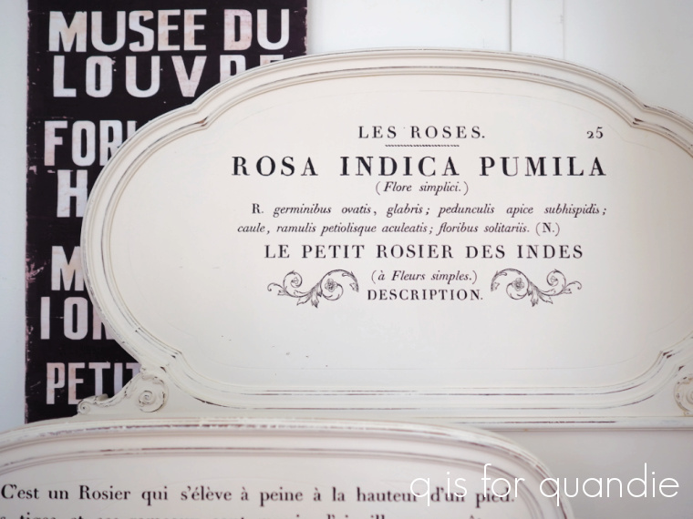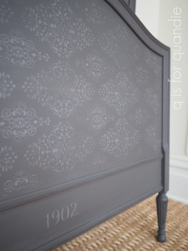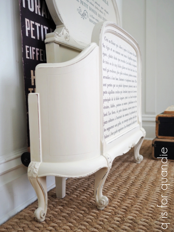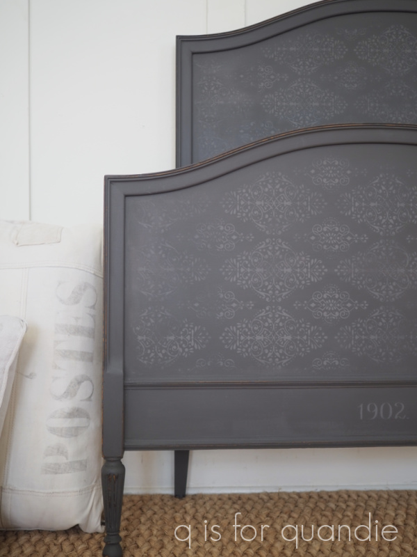 This stencil is from Maison de Stencils, although I’ve seen almost an exact match for it available from Wallcutz as well. With Wallcutz you can order different sizes which is a nice feature, at Maison de Stencils it is available in this one size only. I filled in the bridges in the letters using a small brush to give it less of a ‘stenciled’ look and more of hand painted look. If you’re confused about what that means, here’s a little bench I painted where I didn’t fill in the bridges.