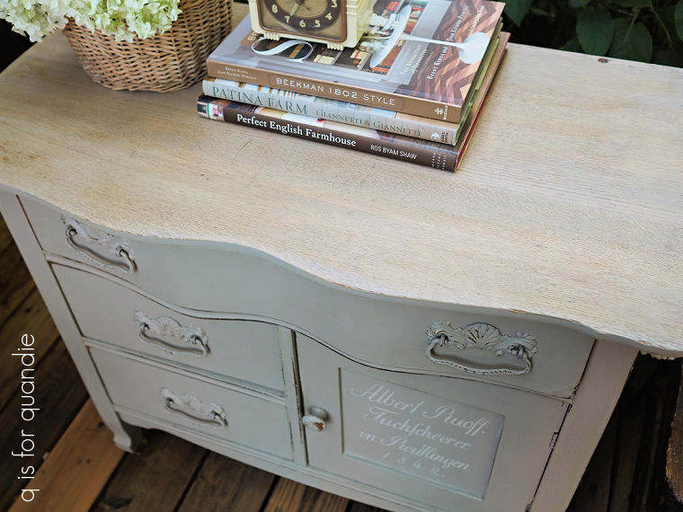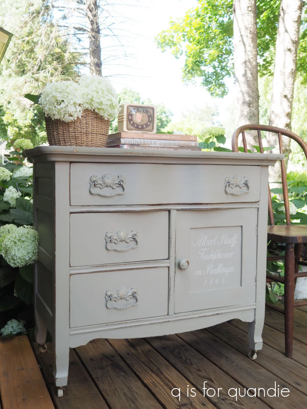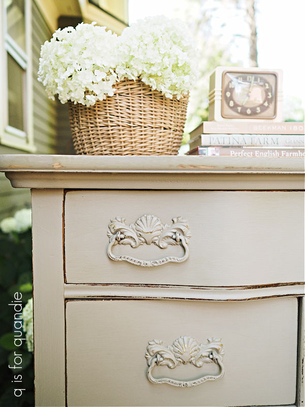 I picked up that hutch at a garage sale earlier this summer. I thought it looked a bit outdated in that wood tone, with those aged brass knobs. I knew it would be fun to give it a new lease on life.