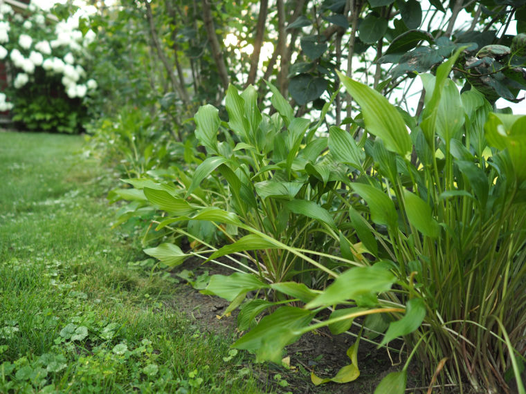 To try and add some bulk down low, I decided to try to underplant the lilacs with some hostas a month or so ago.