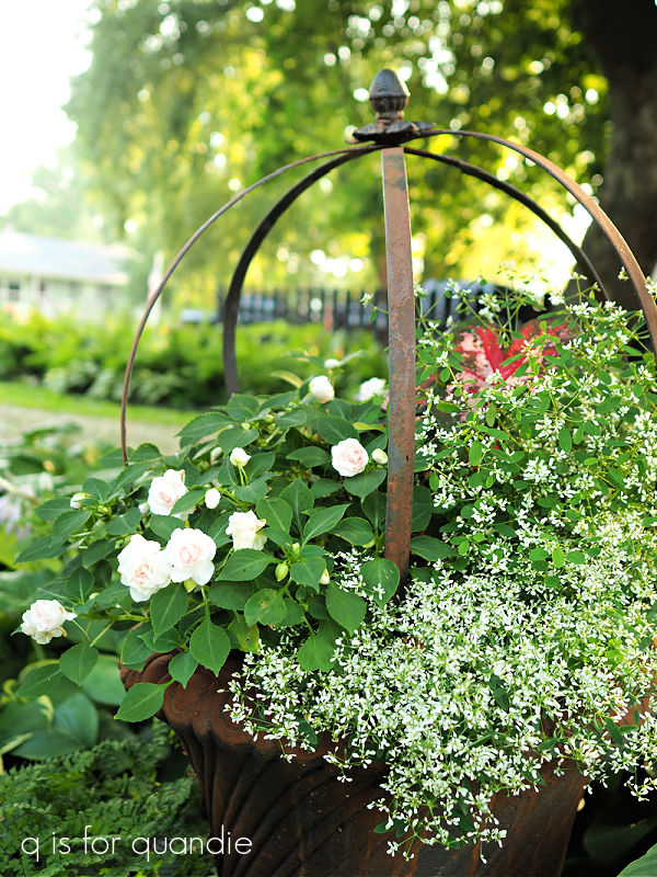 I don’t always go with non-flowering plants in my containers.  I like to attempt to add colorful blooms to some of them, like the ‘window boxes’ made out of old galvanized boilers on my carriage house and potting shed.