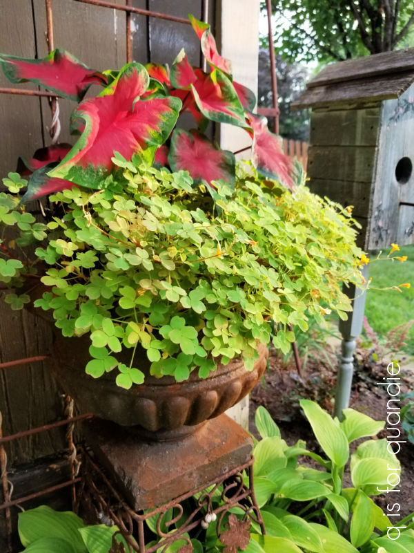 That’s one of my favorite combinations; it’s Molten Lava oxalis with a red caladium (sorry, didn’t retain a name on that one).