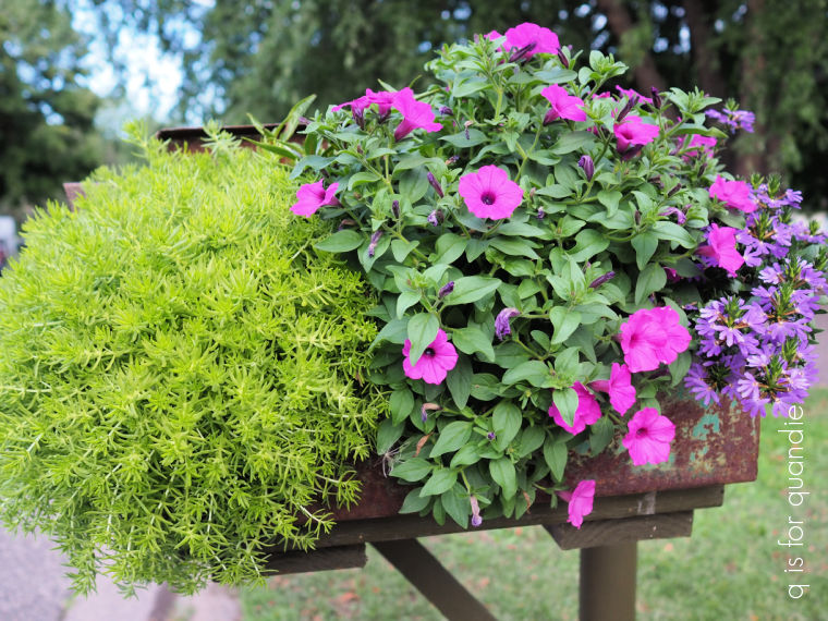 We started out the season with the lemon coral sedum (left), a bright pink new guinea impatien, a small dahlia, and the purple scaevola on the end. As you can see, the impatien and the dahlia didn’t make it. Well, actually, I pulled out the dahlia to put in the Jazzberry. The impatien is still in there but it has been totally overtaken by the Jazzberry.