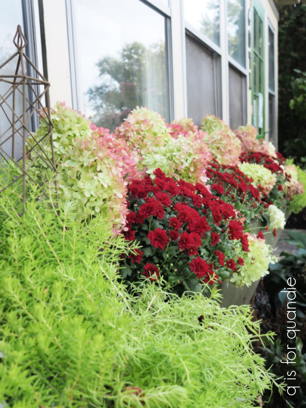 It was a fun one to transition into fall too. I simply pulled out the impatiens and added white mums and pumpkins, and some flower heads that were turning green from one of my hydrangeas.