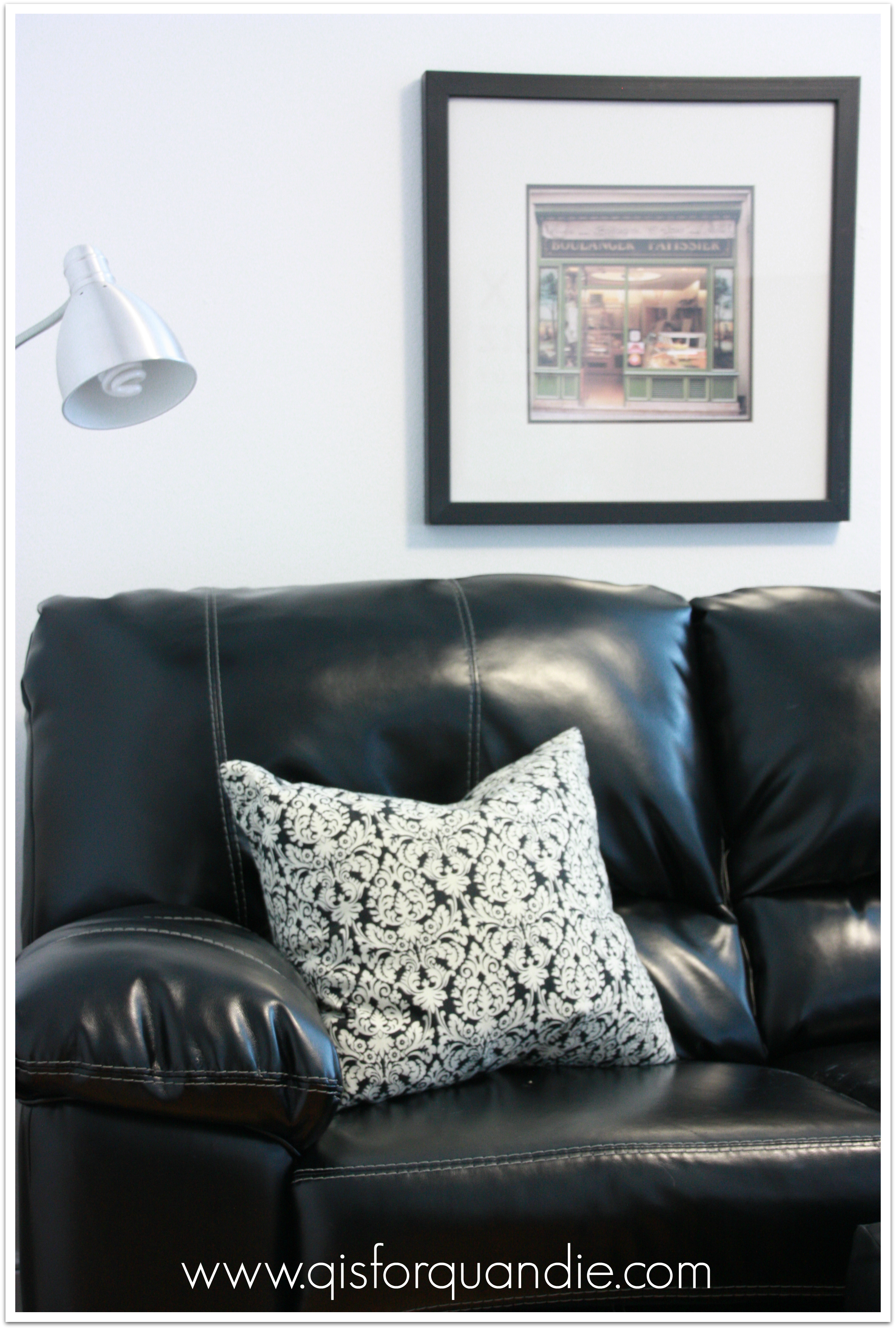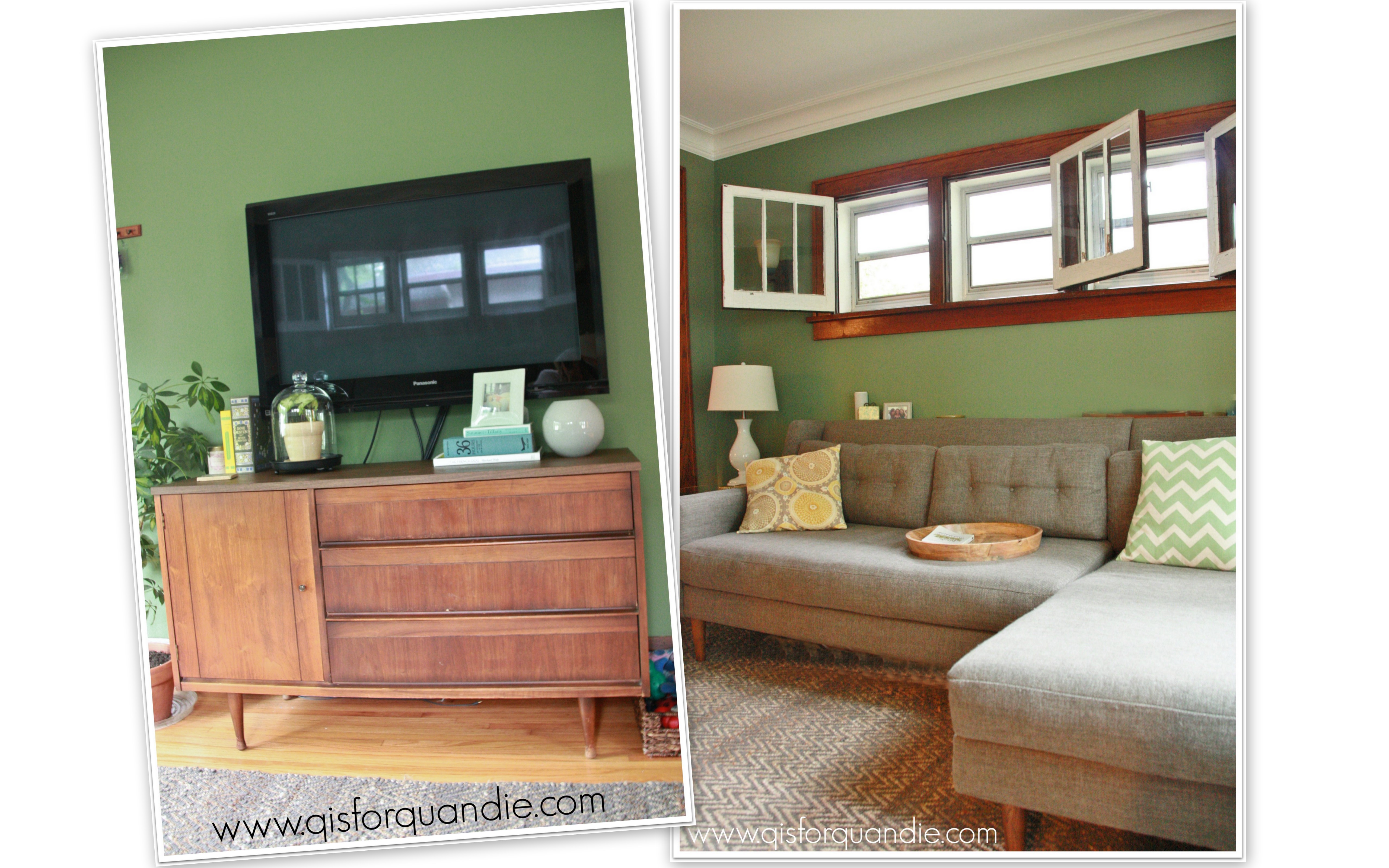 She just moved in to her home this past April, and considering that she’s been in her place less than 5 months, I think she’s done some great things so far. We’re starting in the living/dining room that was already painted this lovely rich green when Jen bought the house. She brought in this gorgeous sectional from West Elm. I love its mid-century, tailored sort of vibe. It’s also quite comfy (and on sale at the moment)! Across from the sofa is a fab mid-century credenza that Jen found with a little help from Craig and his list. She has cleverly outfitted it for her TV with the components just inside the cupboard door. Her router is velcroed to the back! How clever is that? Velcro, people! Get on it.