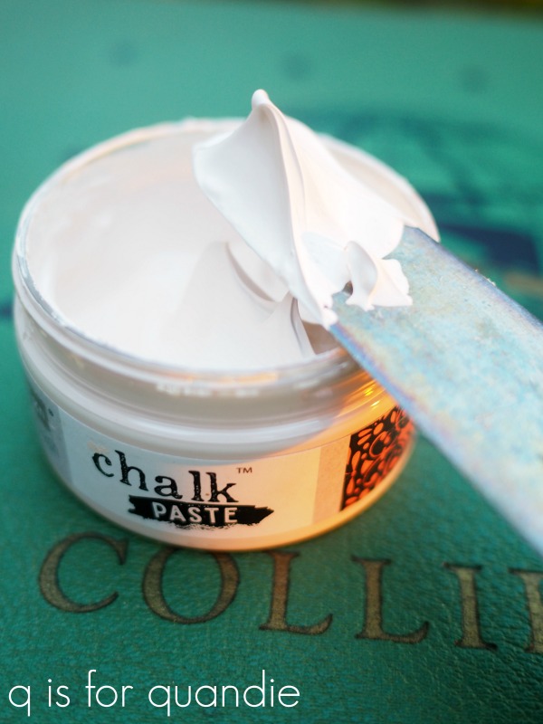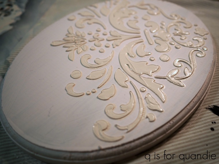 Experiment no. 1 – I painted the oval in a pale blush color that sort of matched the Hubbard Squash chalk paste. Then I pulled out Prima’s Lenore Corners raised stencil which is .04″ deep. These thicker stencils are perfect for this technique.