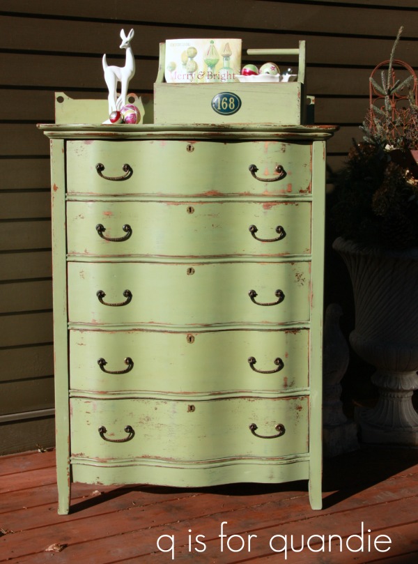 You may have noticed that I sanded the edges and the handle to distress the paint job a bit. You’re always going to see hints of previous paint jobs when you do this, and sure enough you get glimpses of the old aqua here and there.