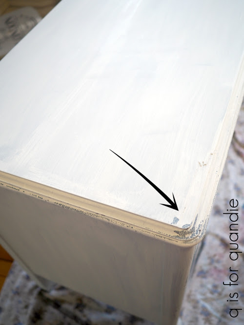 I added just one coat of this color over the white. Once dry I started sanding the edges and discovered the most perfect chipping.