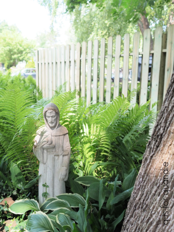 My garage sale find statue, Cossetta, also lives in this garden.