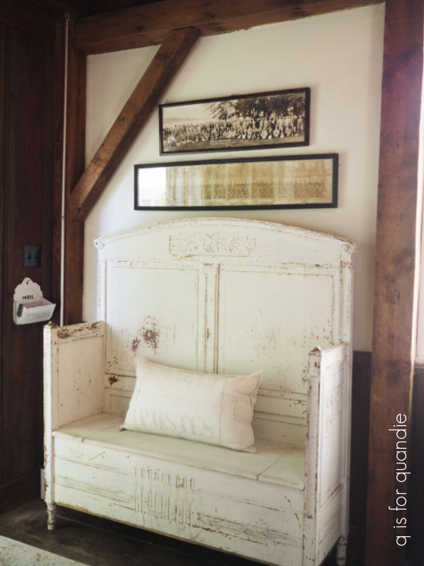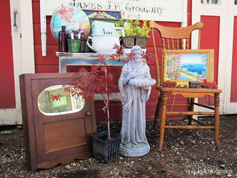 This garden also contains our fountain, and my rusty chair. My neighbor/handyman Ken gave me a set of this grape cluster iron furniture back in 2022. It was painted a crisp white when I got it, but I like something a little more subtle. So I gave the pieces a makeover with Dixie Belle’s patina paint. This chair and the bench both have broken legs, so no one can actually sit on them. I also did not seal the rusty finish, so rust would rub off onto your clothing if you did sit on them. So I tuck them into the garden where no one will make the mistake of trying to actually use them.