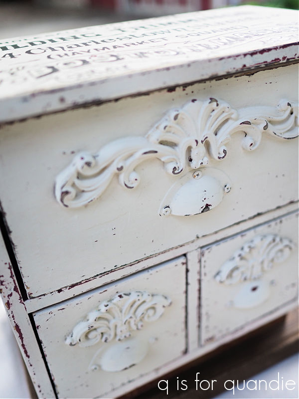 Why? Well, I may keep this piece to corral some flashcards and maybe a pair of readers or two and I’m not sure I love this look. I may decide to give it an entirely different look next, so I’m holding off on waxing in case I decide to paint over it one more time.