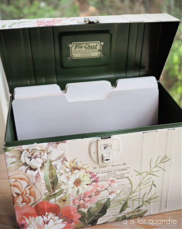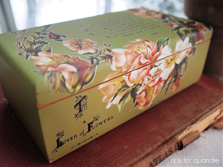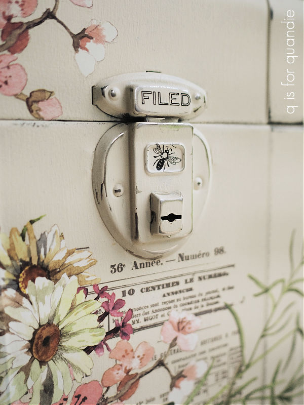 I sanded the transfer off, then repainted the box in Dixie Belle’s Drop Cloth. Once the paint was dry, I decided to attempt to use the I.O.D. Ephemeral Type stamp on it. I still have very mixed results with stamping, but I’m working on it.