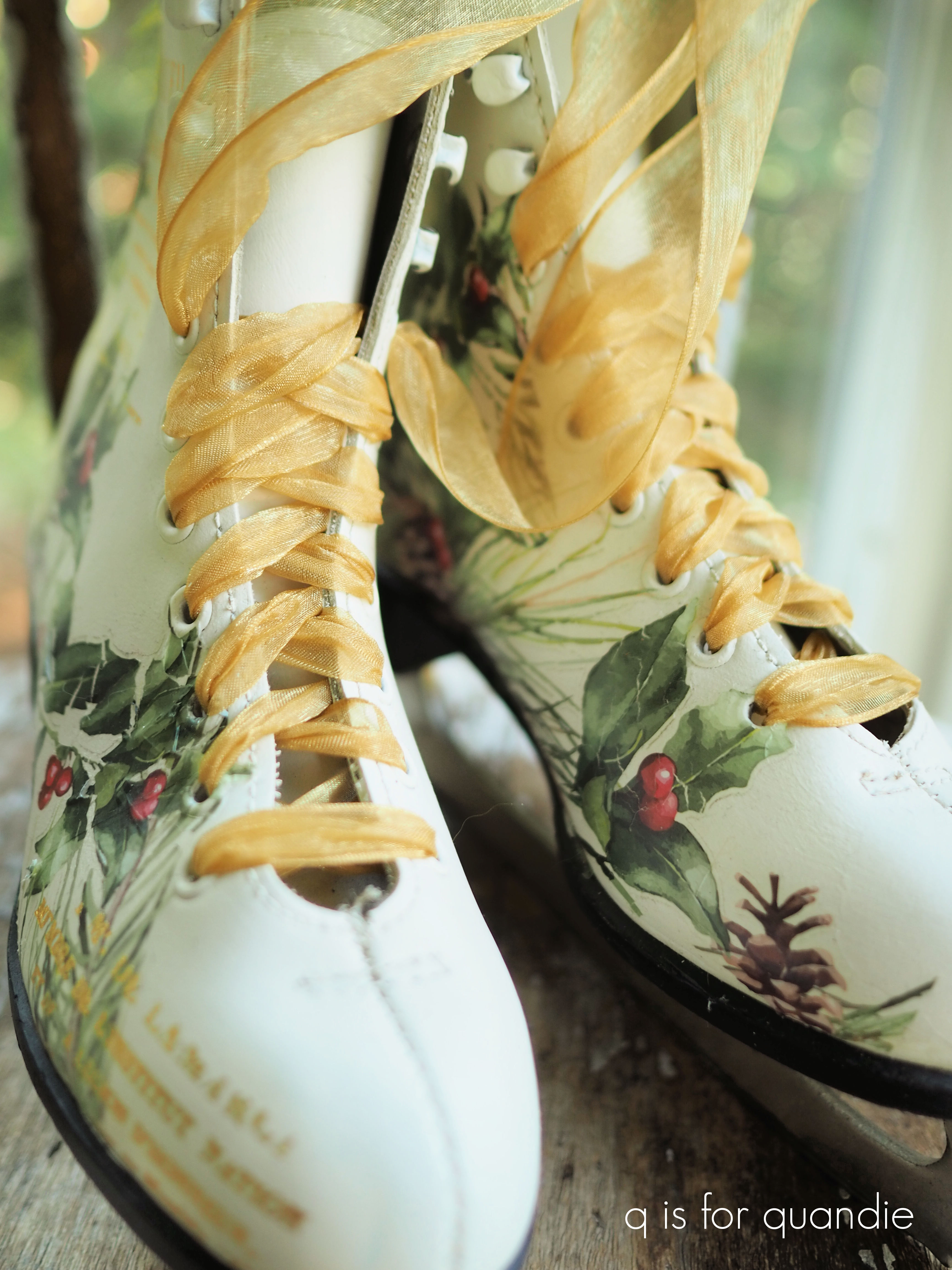 The original laces for this pair of skates were pretty worn out, so I removed them and added some gold ribbon instead.