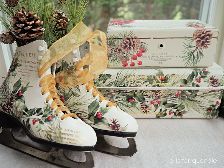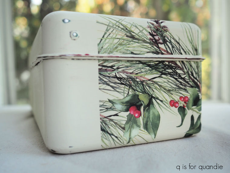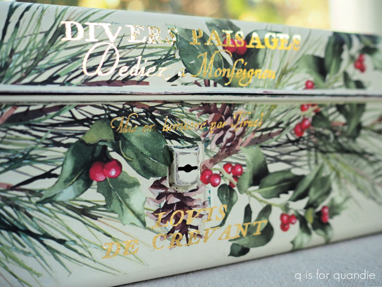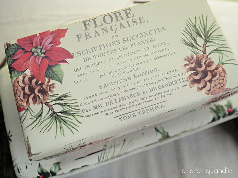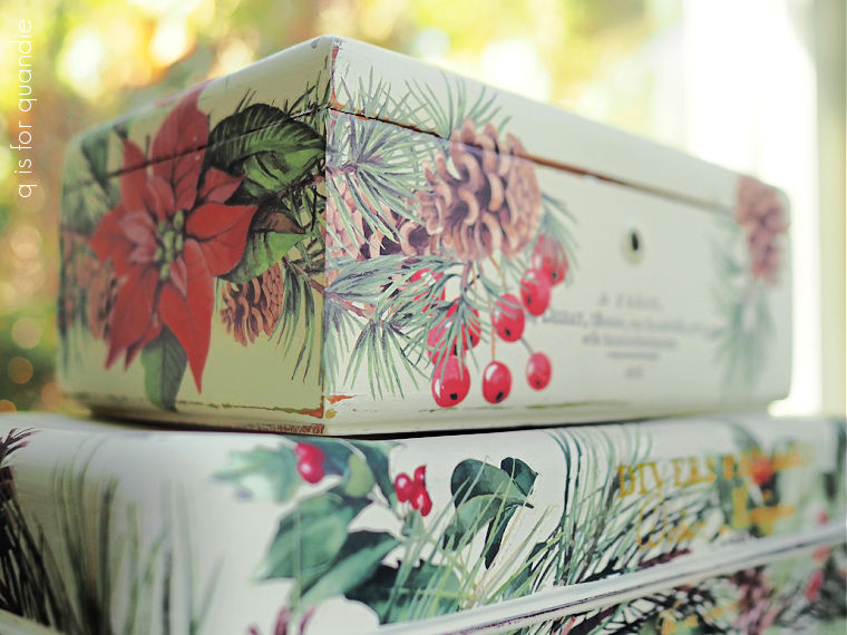 If you were to scrutinize them closely, you’d see where I once again struggled to get the entire design transferred cleanly. But I don’t think it really matters so much when it’s layered over the holly, it just looks worn and distressed … in a good way.