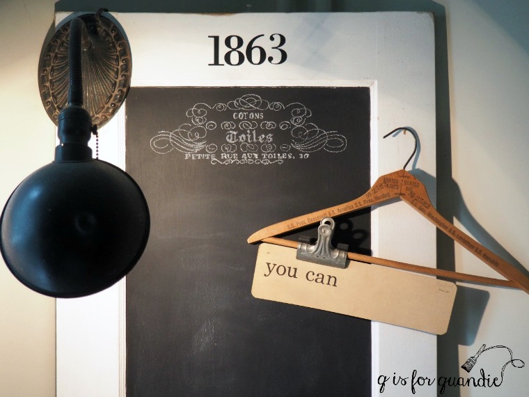 I’ve added a vintage light, some vinyl Cricut numbers and and old hanger with an inspiring message.